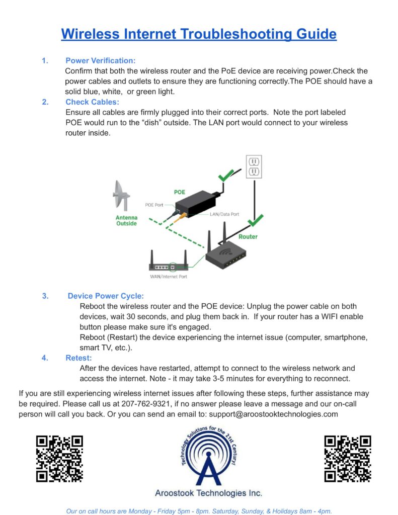 At Aroostook Technologies taking care of our customers is of paramount importance. If you should have any issues with your Wireless Internet you can contact us at 207-762-9321 or by email at support@aroostooktechnologies.com
